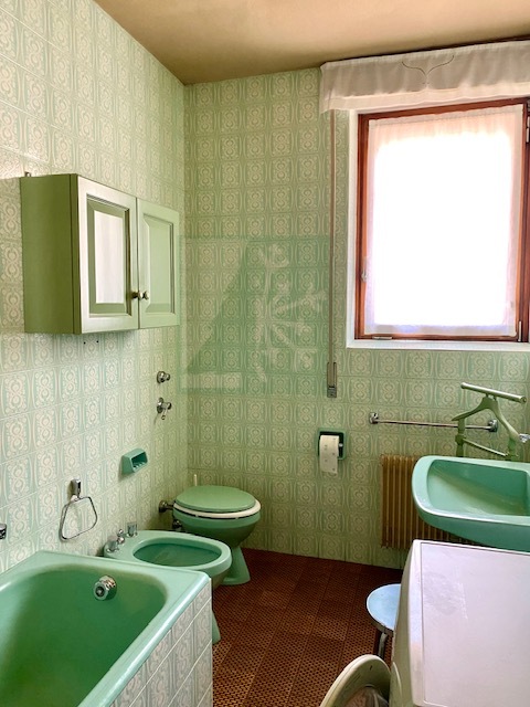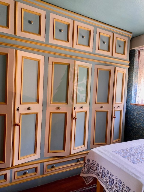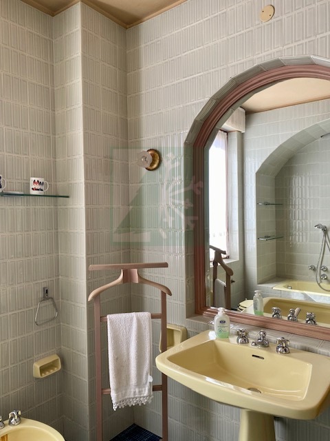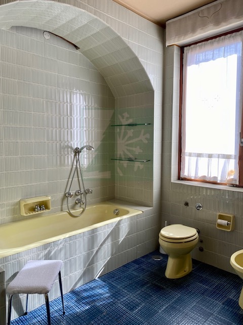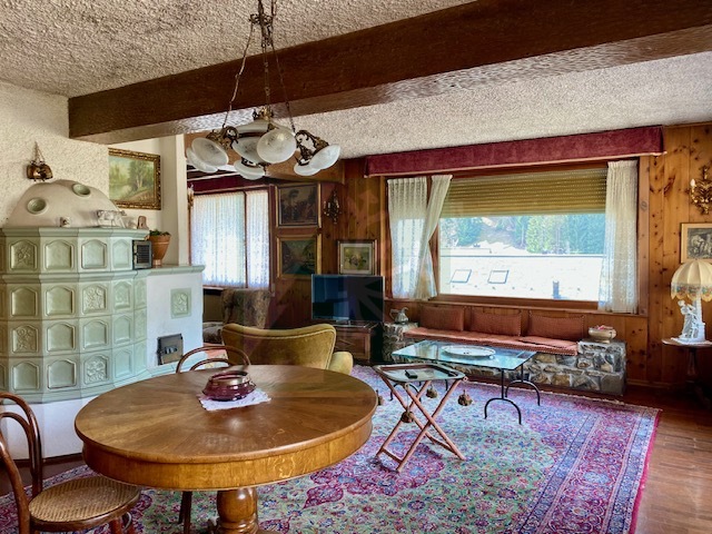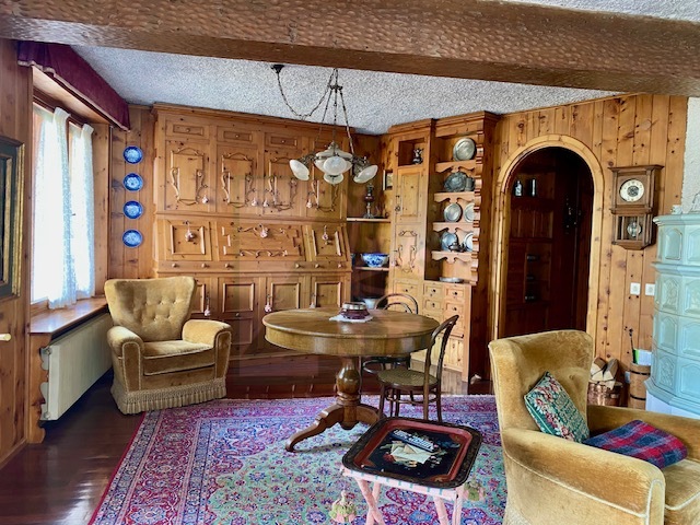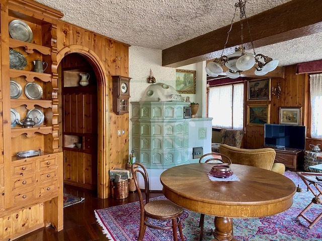 L’appartamento del piano primo è composta da: ingresso che conduce ad un ampio salone con vetrate, camino e stufa tirolese, area pranzo e tinello. La cucina è abitabile. Nella zona notte con seconda stufa tirolese si trovano 4 camere da letto, 2 bagni, uno studio e un locale guardaroba. Gli armadi su misura e l’arredo ancora attuale conferiscono un tocco di eleganza e raffinatezza all’intero appartamento.